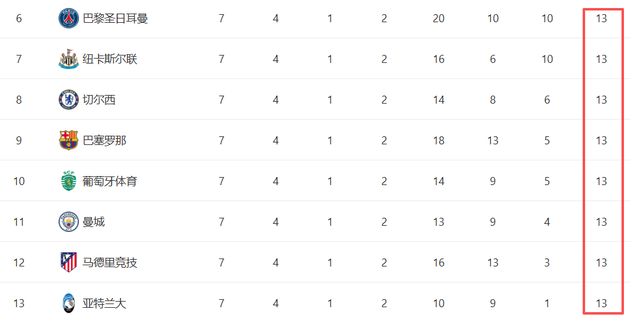 巴黎圣日耳曼13分10個凈勝球,紐卡13分10個凈勝球,切爾西13分6個凈勝球,巴薩13分5個凈勝球,葡萄牙體育13分5個凈勝球,曼城13分4個凈勝球,馬競13分3個凈勝球,亞特蘭大13分1個凈勝球。